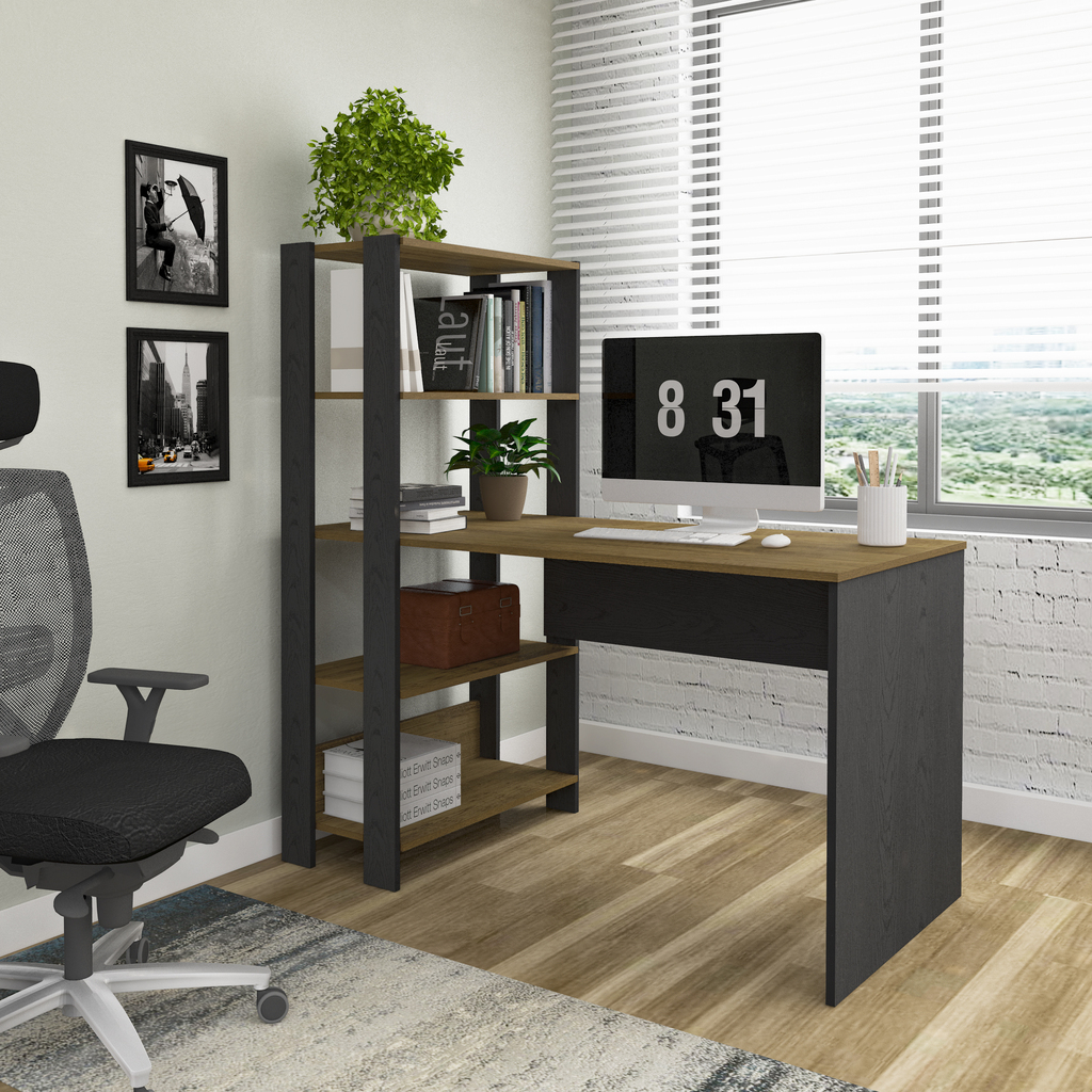 - Diseño moderno y estructurado: Integrá una superficie amplia de trabajo con una biblioteca vertical incorporada, aportando estilo sofisticado a cualquier ambiente.